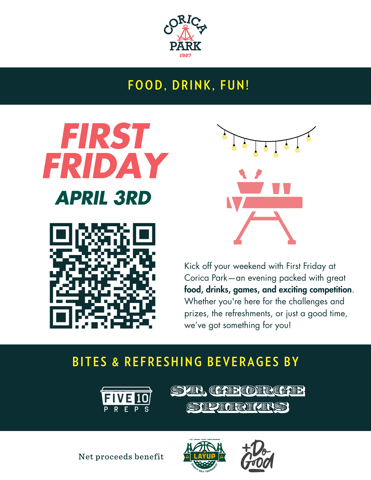 Join us for First Friday at Corica Park on April 3rd—an evening built around great food, refreshing drinks, friendly competition, and community vibes that actually feel like community.